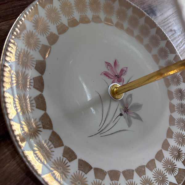 Etagero aus einer Sammeltasse, regional secondhand erworben und von Hand zu einer Etagere verarbeitet.
